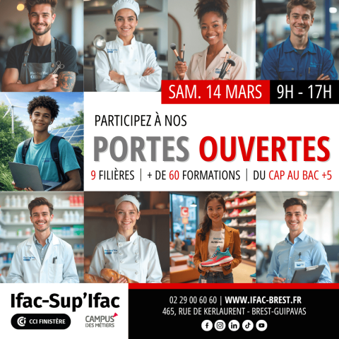 Samedi 14 mars 2026, de 9h à 17h, participez à la journée Portes Ouvertes de l’Ifac-Sup'Ifac au Campus des métiers de Brest-Guipavas !