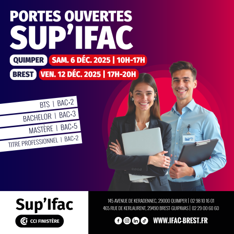 Sup'Ifac à Quimper a le plaisir d’ouvrir les portes de son campus le samedi 6 décembre 2025 de 10h à 17h lors d’une journée entièrement dédiée à l'orientation et la formation supérieure.